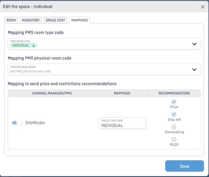 To receive data from your PMS you need to map the space created in Beonprice with the equivalent in your PMS.
